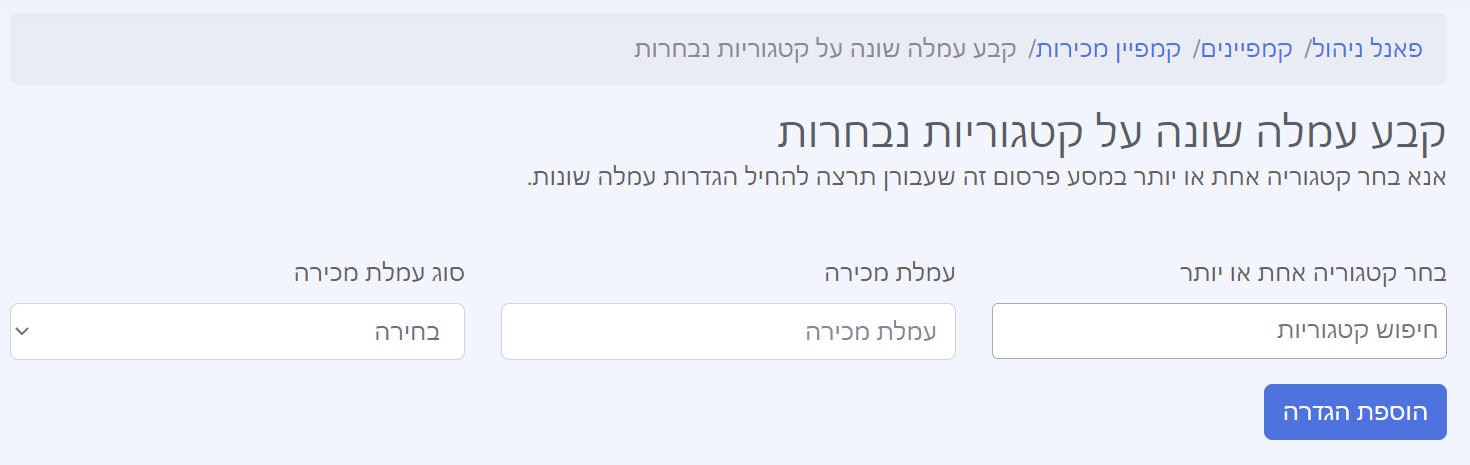 כדי לשנות את העמלה לפי קטגורות או מוצרים עקבו אחרי ההוראות הבאות: